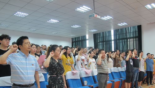 活动在庄严的《国际歌》中开始,学院党委宣传委员作为领誓人、纪检委员作为监誓人带领全体新老党员面向党旗庄严宣誓。