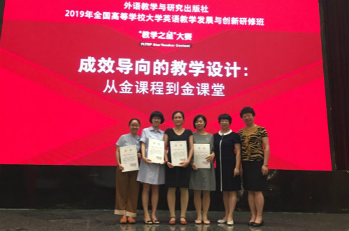 近日,2019年外研社“教学之星”大赛全国半决赛在苏州举行,来自全国高校的56支复赛特等奖团队参加了比赛。在我校外国语学院大学英语教学部主任黄慧君、副主任江亦川的带领下,经过紧张激烈的角逐,由学院许美华、甘庭芳、郑惠瑛、杨若琳、余小敏五位老师组成的团队获大学英语组二等奖。
