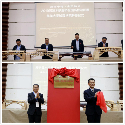12月16日,“廊桥申遗·全民助力”2019闽浙木拱廊桥全国高校巡回展福建省内高校第一站活动走进诚毅学院,现场展出了由诚毅学院师生参与设计制作的木拱廊桥模型、文创作品、研学旅行课件等,还举行了“木拱廊桥文创研发基地”揭牌仪式、木拱廊桥校地合作文化传承创新洽谈会、学术讲座以及民族传统文化校地文艺联合展演等系列配套活动。