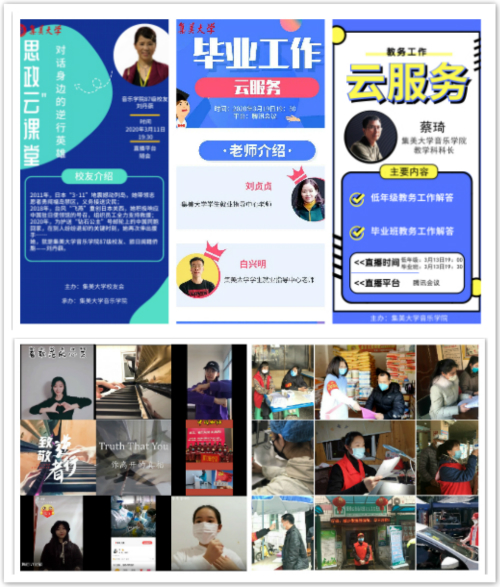 在疫情防控期间,音乐学院坚持防疫与育人相结合,战“疫”与暖心并举,将学生工作搬上云端,根据学生的实际情况和需求,聚焦思想引领、文化育人、教学服务、毕业教育、就业指导、同侪示范等多个维度,推出了系列学生工作“云”服务,坚持主动发声、正面引导、树立信心、暖心服务,确保了学生工作“不掉线”、服务学生“不远离”。