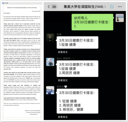 配合学校职能部门做好海外疫情监控。为切实掌握我校国际学生在海外的生活和健康情况,学院积极配合国际合作交流处、学生工作部等部门做好海外疫情实时监控。通过“完美校园”健康打卡和学生微信群的每日健康汇报,及时汇总相关数据,监控国际学生的健康状况。了解各国疫情态势和相关政策,第一时间将最新动态转发给学生,做好与国际学生间的信息交流与沟通。