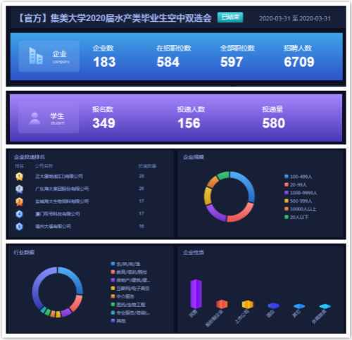 3月31日,水产学院携手《水产前沿》杂志依托智联招聘平台举办了校2020届水产类毕业生专场空中双选会,以应对疫情对学院就业工作的冲击,为学院毕业生和用人单位搭建安全、便捷、精准的双向交流平台。
