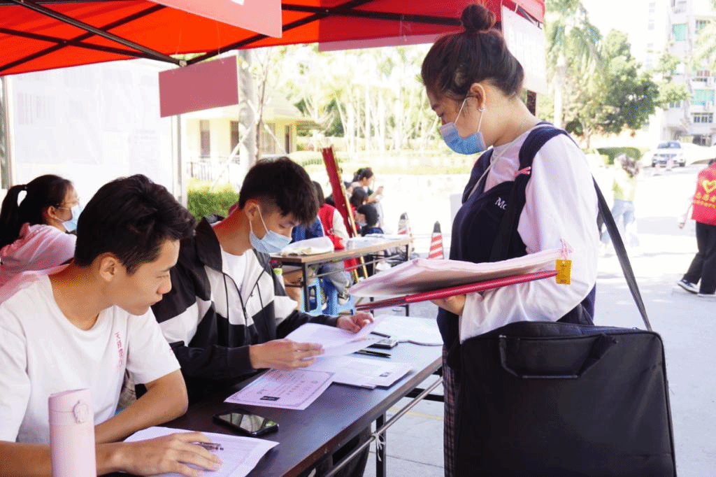 在迎新点,志愿者引导新生分别进行测温、签到、人脸识别、验证身份以及提交相关材料等,各个环节紧凑有序。完成入学手续后,在志愿者引导下入住学生宿舍。