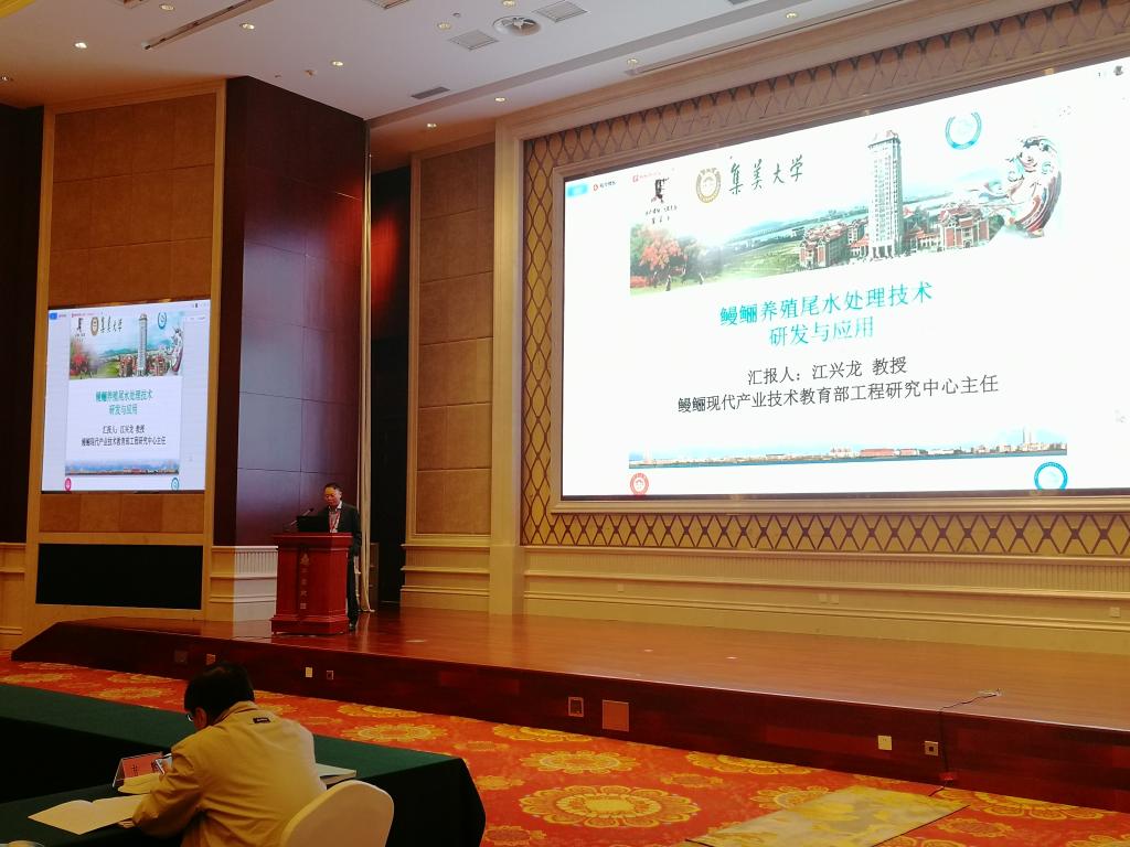 10月27日,农业农村部渔业渔政管理局在山东省威海荣成市组织召开了“全国沿海水产养殖绿色发展经验交流会”,大会共邀请了两位专家作大会专题报告,我校鳗鲡现代产业技术教育部工程研究中心主任江兴龙教授作了《鳗鲡养殖尾水处理技术研发与应用》的专题报告,向大会介绍了近年来在养殖尾水处理方面的成功实践,为突破水产养殖可持续发展的技术瓶颈提供了有力的技术支撑。