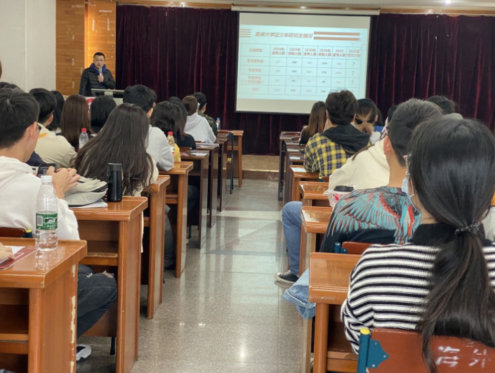 学院负责就业指导教师介绍了学院近三年来成功考取国内研究生的毕业生个案,建议2018级学生早日确定考研目标,认真科学备考,积极提升学历,为未来就业积累更扎实的专业学识和理论基础。 2018级辅导员也结合个人考研经验,对硕士研究生考试的备考注意事项、专业选择以及志愿填报进行了详细说明。