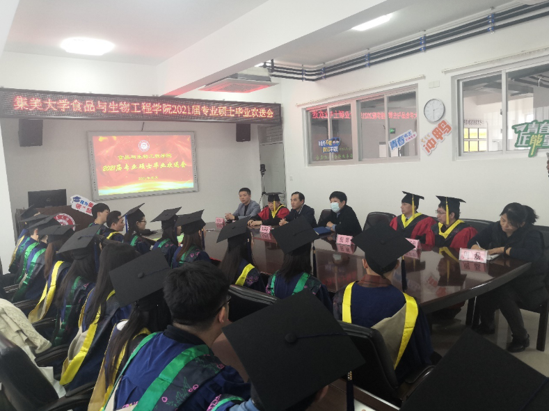 1月6日,食品与生物工程学院举行2021届专业硕士毕业研究生欢送会。院党委书记杨一青、党委副书记朱坤道、副院长倪辉、副院长李健、食工系主任翁武银、科研办副主任周磊、辅导员徐梁棕以及全体毕业生参加此次欢送会。本次会议由朱坤道主持。
