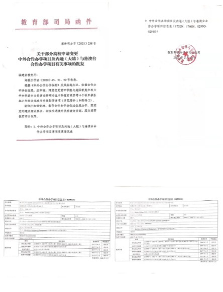 近日,福建省教育厅转发教育部国际合作与交流司《关于部分高校申请变更中外合作办学项目及内地(大陆)与港澳台合作办学项目有关事项的批复》(教外司办学[2021]238号),我校与美国库克学院合作举办工商管理专业学士学位教育项目和国际会计专业学士学位教育项目延期申请成功获批。