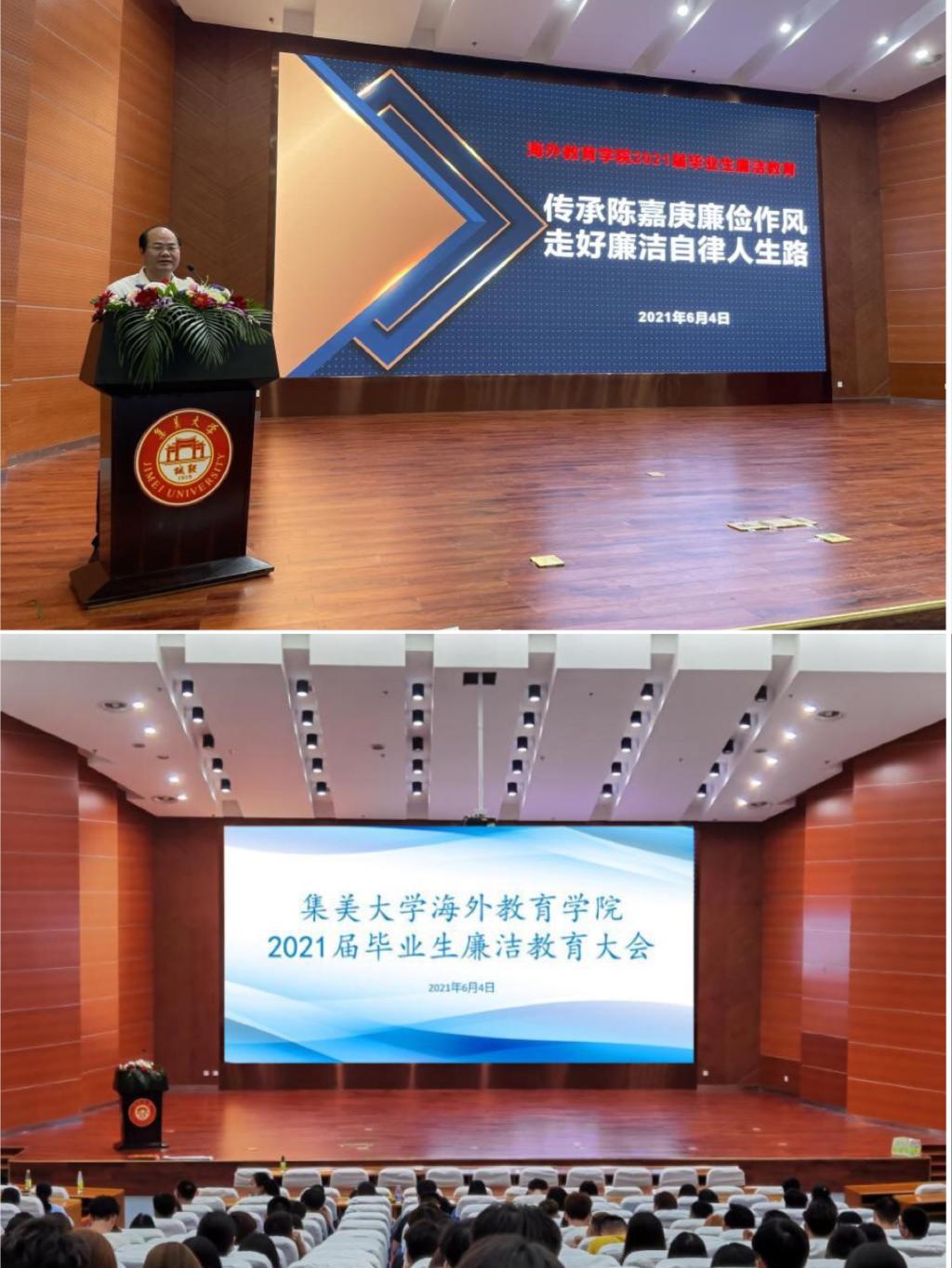 6月4日下午,海外教育学院在尚大楼105报告厅召开毕业生廉洁教育大会,学院党委副书记陈茂才为毕业生上“传承嘉庚廉俭作风,走好廉洁自律人生路”主题党课。毕业班辅导员和中美合作办学库克项目2021届全体毕业生参加。
