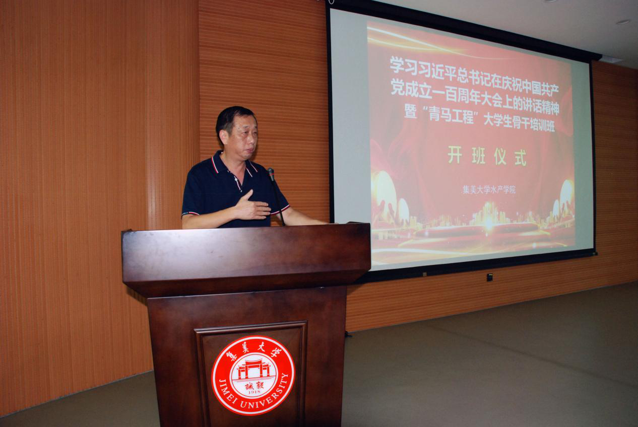 7月3日,水产学院学习习近平总书记在庆祝中国共产党成立一百周年大会上的重要讲话精神暨“青马工程”大学生骨干培训班开班仪式在水产综合楼报告厅举行,以引导学生骨干率先学习领会习近平总书记在庆祝中国共产党成立一百周年大会上重要讲话精神,并通过他们在全院各团支部掀起学习贯彻落实习近平总书记在庆祝中国共产党成立一百周年大会上重要讲话精神的热潮。学院党委书记范惠莹、学院党委副书记黄庆胜、学院团委书记张艳娇及培训班各位导师到场参加开班仪式。