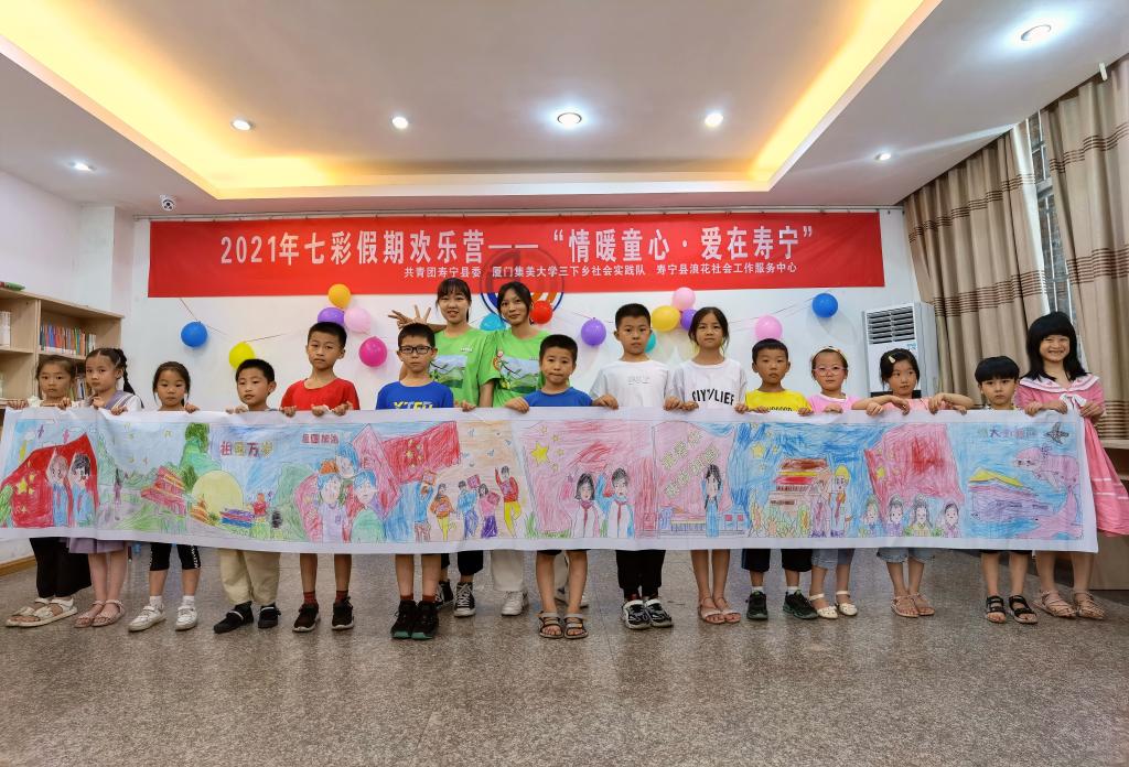 “情暖童心,爱在寿宁”实践队以“培养青少年从小树立为党的事业而奋斗的观念”为目的,在福建省寿宁县青少年之家开展“党史教育铭初心,奋勇争先担使命”的党史教育课程。实践队员向孩子们介绍了从加入中国少年先锋队到加入中国共青团,最后成为一名中共党员的过程,以通俗易懂的方式加深孩子们对中国共产党的认识。同时,实践队员讲述红军长征故事等内容进一步展现中国共产党所弘扬的精气神,在孩子们心底播撒爱党爱国爱社会主义的种子。