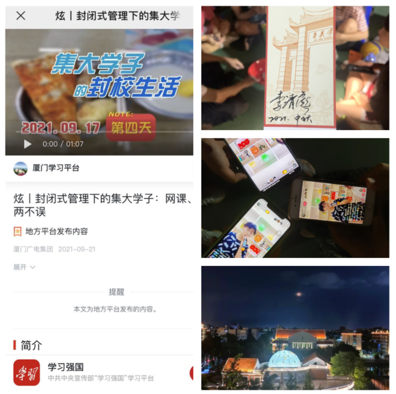 同时,学院举办了“月满,爱也满”中秋线上音乐会,共拍中秋明月摄影活动等活动,点亮疫情当前的校园生活,让爱无限传递、陪伴左右。音乐会现场,学生们尽显青春活力,用歌声透过屏幕进行互动,传递快乐与温馨,纷纷表达对中秋的美好祝愿。中秋夜,厦门电视台、学习强国学习平台报道学院学生自拍的封校生活视频《集大学子的封校生活》,学生通过视频记录,防疫和网课两不误。