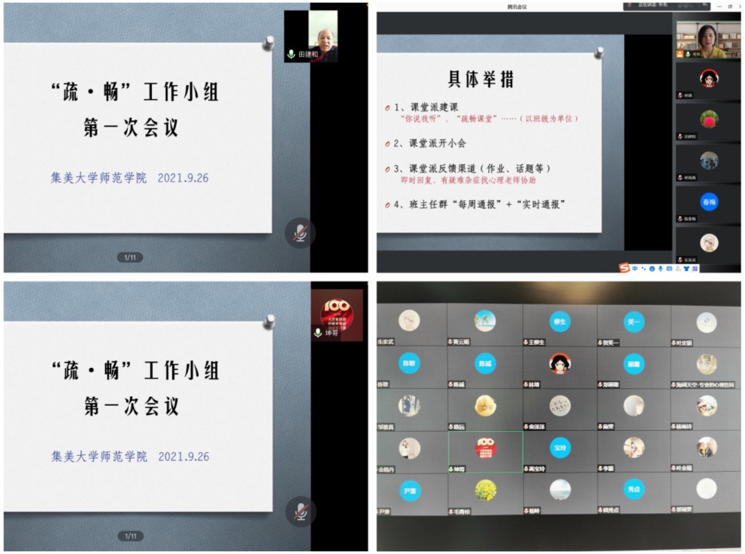 为认真落实学校疫情防控指挥部工作部署,全力做好师范学院疫情防控工作,切实保障疫情防控期间学生思想引导和心理健康,畅通学生疏解不良情绪、反映问题和诉求的渠道,学院以班主任和专业教师为抓手,依托学院专业心理教师设立年级负责人,组建学生“疏﹒畅”工作小组。9月26日上午,工作小组召开专题线上会议,学院党委书记田建和、副院长谢书书,党委副书记郑秀坤、心理专业教师和辅导员、班主任参加了会议。会议由谢书书主持。