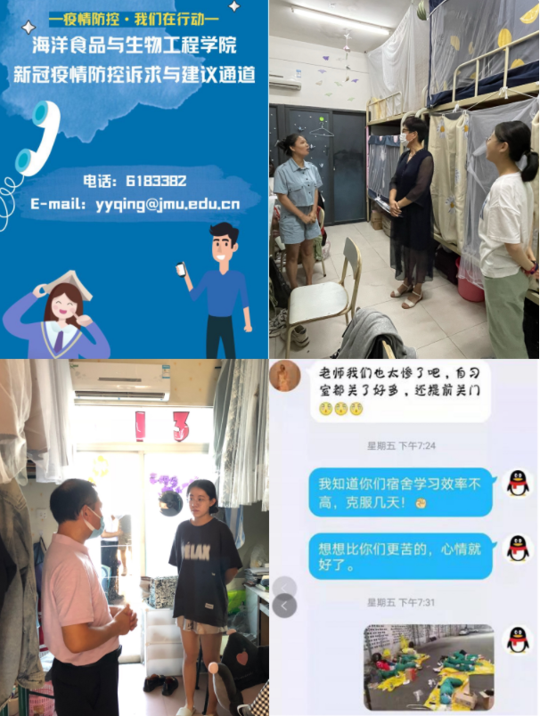 为拓宽学生的诉求建议渠道,海洋食品与生物工程学院开通24小时“新冠肺炎疫情防控诉求与建议通道”,倾听同学们的建议,及时掌握了解学生面临的新困难,有效帮助解决学生的合理诉求。