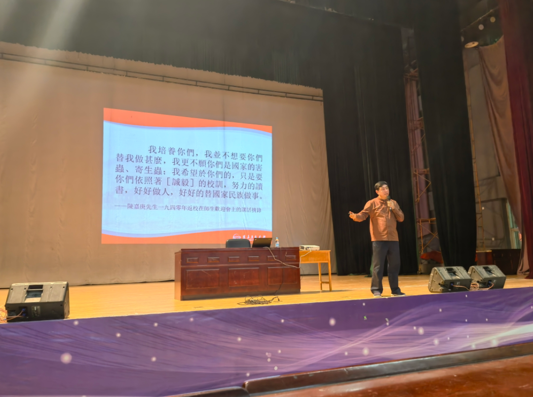 陈呈从“陈嘉庚先生其人”“陈嘉庚先生与办学”“陈嘉庚先生与抗战”“陈嘉庚先生与祖国”以及“陈嘉庚精神的继承与光大”五个方面阐释了陈嘉庚先生的光辉事迹与伟大精神。他以一幅幅珍贵的历史照片讲述了校主嘉庚先生抗日救国、倾资兴学的光辉事迹,剖析了嘉庚先生卓越的远见以及他对厦门城市发展的深远影响,让轮机新生们从源头上了解了陈嘉庚先生的为人和思想,从内涵上理解了“诚毅”校训中蕴含的嘉庚先生对学子的殷切期望。最后精彩的提问环节,陈呈老师对同学们的踊跃提问,都一一进行回答。