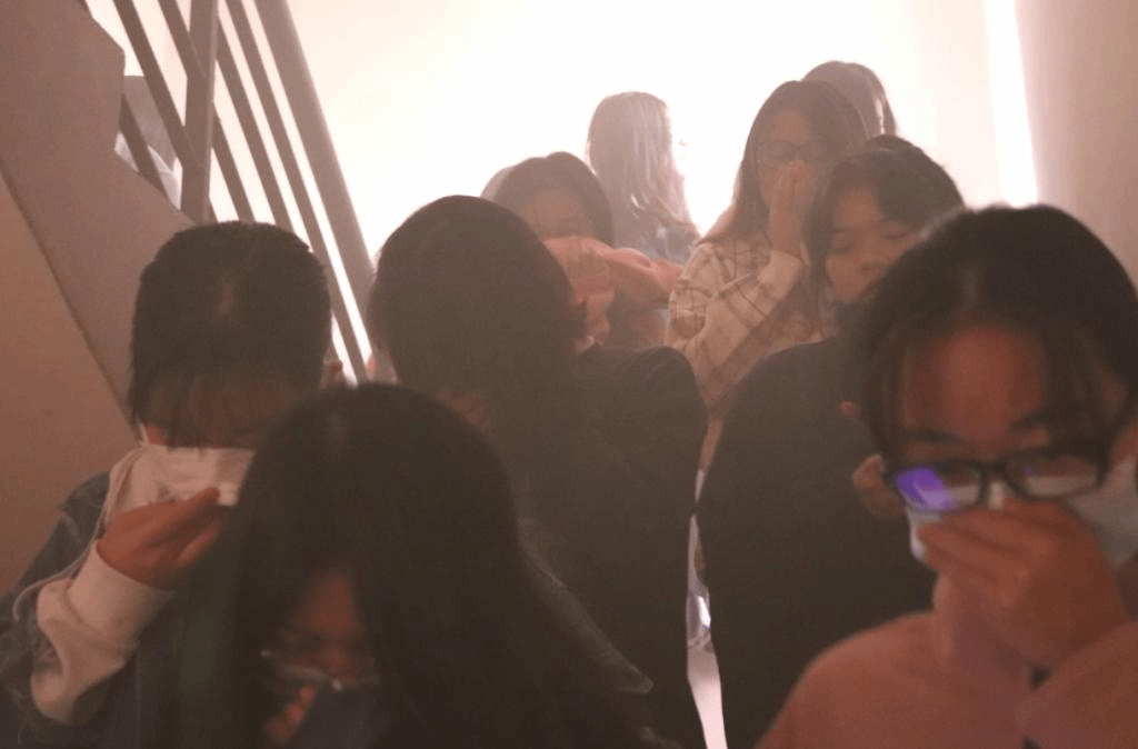 演练于14时正式开始,工作人员燃放烟雾弹、吹响口哨,引导学生有序疏散。学生用湿毛巾捂住口鼻,弯腰前进,按照规定路线迅速撤离到了指定集合地点。