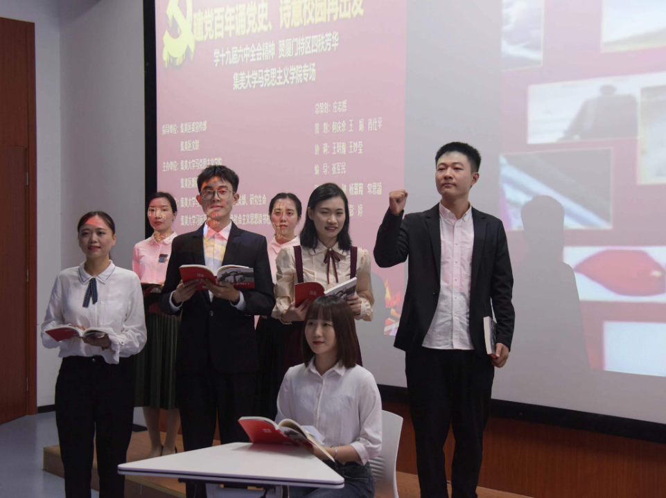 近日,马克思主义学院与厦门市集美区朗诵艺术协会于嘉庚图书馆一楼思政课虚拟仿真教学中心联合举办了“建党百年诵党史,诗意校园再出发”主题经典诵读活动。集美区宣传部部委会成员、集美区文联主席何庆余先生、学院领导及学院师生观摩了本次活动。