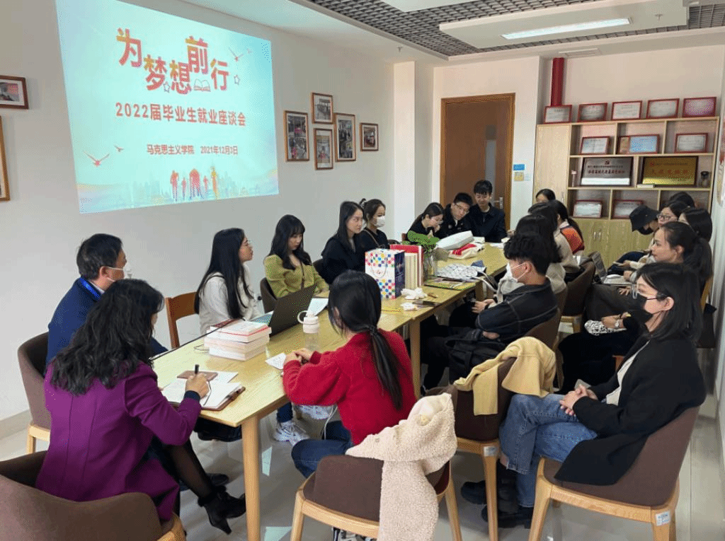 近期,马克思主义学院召开了2022届毕业生就业座谈会。学院党委书记王娟、院办公室主任邢建民、辅导员王妙莹以及全体2022届毕业生参加本次座谈会,会议由王妙莹主持。