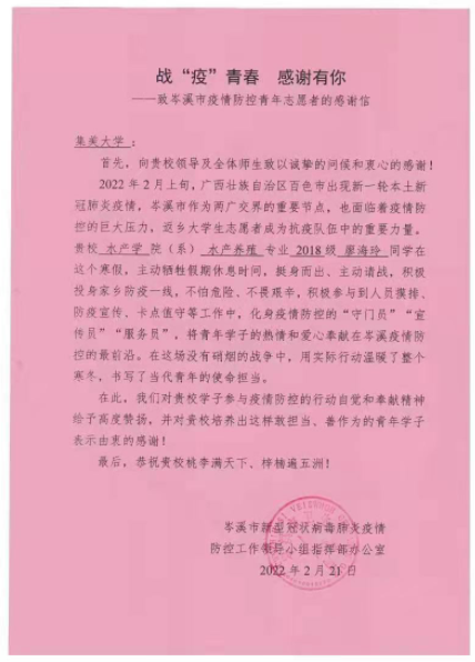 近日,水产学院收到来自广西岑溪市疫情防控办公室感谢信,信中特别提到养殖18级廖海玲同学在百色地区出现本土病例的第一时间挺身而出,主动请战,牺牲休息时间,参与家乡一线防疫志愿者工作,并不畏艰险,积极参与摸排、防疫宣传、卡点值守等多项工作,书写了当代青年的使命担当。