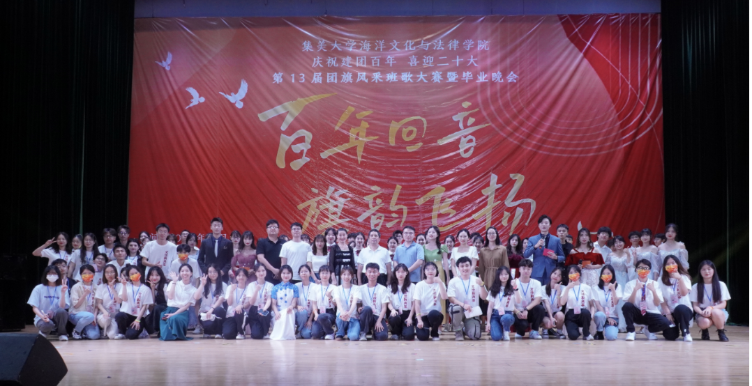 为献礼中国共产主义青年团成立一百周年,喜迎党的二十大胜利召开,展现海洋文化与法律学院学子们的青春活力,5月29日晚,学院在古龙大礼堂成功举办第13届“百年回音  旗韵飞扬”团旗风采班歌大赛暨毕业生欢送晚会。