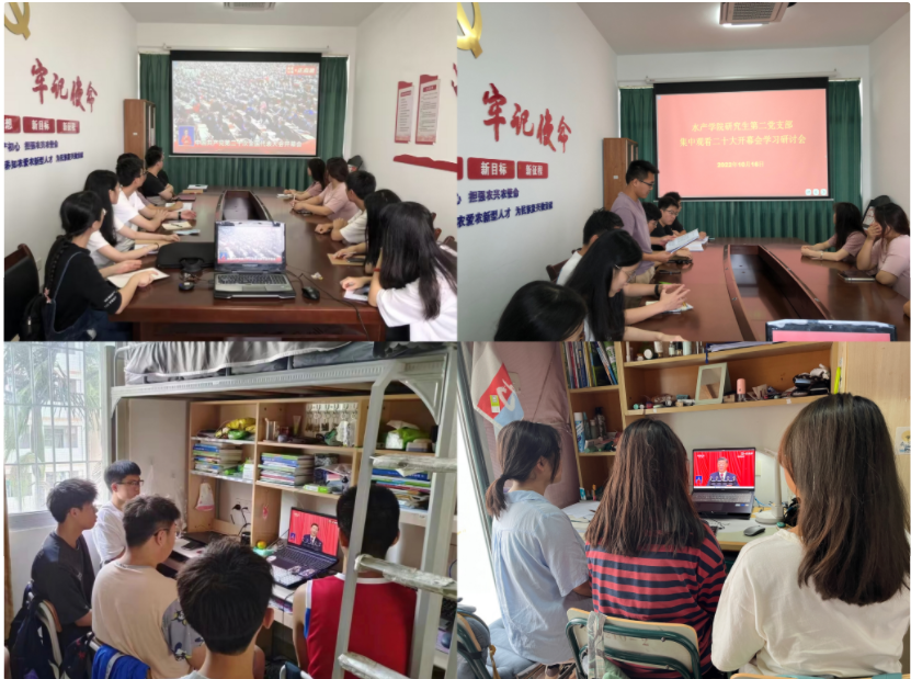 10月16日,中国共产党第二十次全国代表大会在北京开幕。水产学院党委组织全体院领导、党员教职工、学生代表在水产综合楼一楼报告厅集中观看开幕会直播,其他未到场师生通过电视、网络等多种方式在会议室、宿舍等地方收听收看开幕会直播。大家在听取报告后,内心深受鼓舞,倍感振奋,纷纷畅谈感想体会。