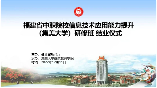 12月11日,继续教育学院举行了“2022年福建省中职院校信息技术应用能力提升培训班”线上结业仪式,学院院长陈养元、师范学院教授李彦敏等老师出席结业仪式。此次培训班由福建省教育厅主办以及亚洲中文精品乱码继续教育学院承办、师范学院协办。