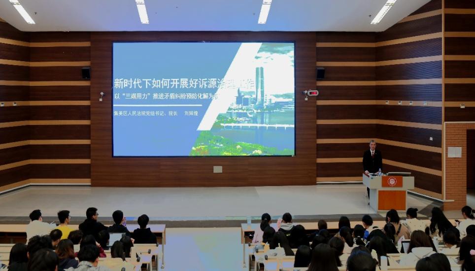 刘辉煌以《新时代下如何开展好诉源治理工作——以“三端用力”推进矛盾纠纷预防化解为例》为题,围绕在“非诉端”用力——创建“一体三翼”治理格局、在“诉讼端”用力——精准施策避免以案生案、在“执行端”用力——“三减量”机制推进执源治理三个方面深入细致讲解,并结合具体案例,阐明了如何从三个角度开展好诉源治理工作。刘辉煌勉励同学们认真学习新时代法治思想,学好专业知识和技能,将个人的理想追求与国家的前途命运紧密结合,争做新时代的爱国青年。