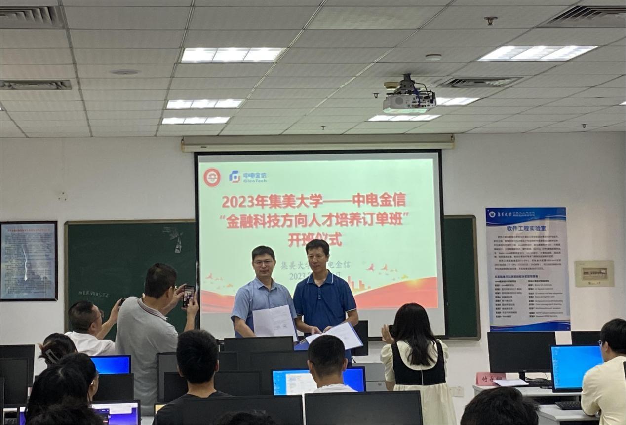 6月26日上午,计算机工程学院举行中电金信软件有限公司合作签约暨2024届共建班启动仪式。学院副院长付永钢、党委副书记叶烽,中电金信软件有限公司数字化营销与移动金融事业部副总经理沈彬彬、高级业务咨询顾问邓仕光等以及2020级参训学员参加仪式。