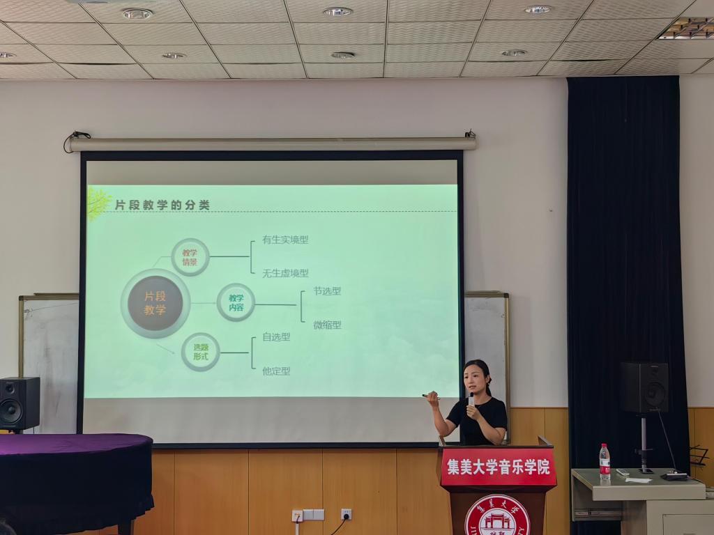 蔡丽珺就今年厦门市教招政策作了详细解读,围绕“育美、求实、素质、创新”四个方面讲解了音乐课堂的课程教学目标,并通过案例视频形象解析了片断教学的方法及评价要点,使学生们对片段教学的整体过程有了清晰的认识。她提出了三点建议:要重视课堂板书与学生互动;要熟悉教材,丰富知识储备;要善于发挥个人长处,注重课堂风采展示。