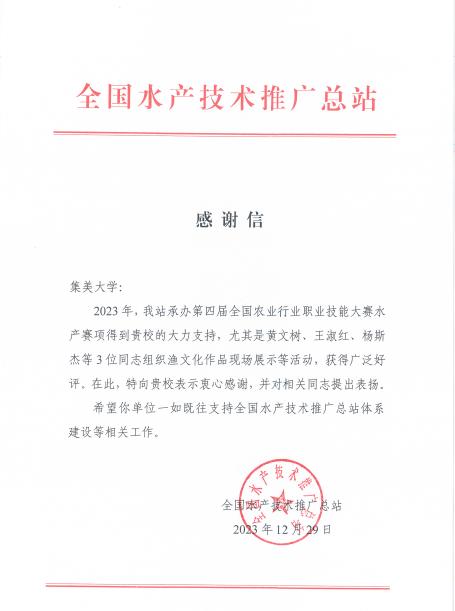 近日,全国水产技术推广总站再次向我校发来感谢信。来信中,全国水产技术推广总站对我校在第四届全国农业行业职业技能大赛水产赛中给予的大力支持表示感谢,并对我校水产学院黄文树、王淑红老师及杨斯杰同学出色完成渔文化作品展览表示感谢。