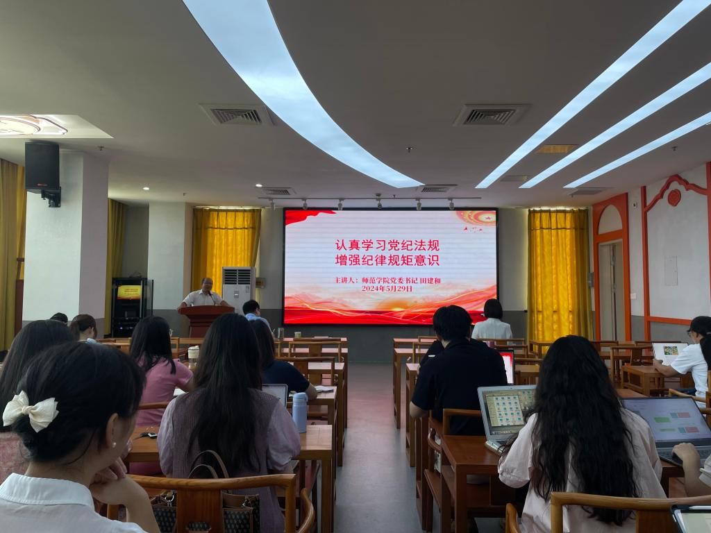 为推动党纪学习教育走深走实,进一步教育引导教职工学纪、知纪、明纪、守纪,5月29日,师范学院举办党纪学习教育专题辅导报告暨党委理论学习中心组(扩大)专题学习会。院党委书记田建和作《认真学习党纪法规,增强纪律规矩意识》专题辅导报告。