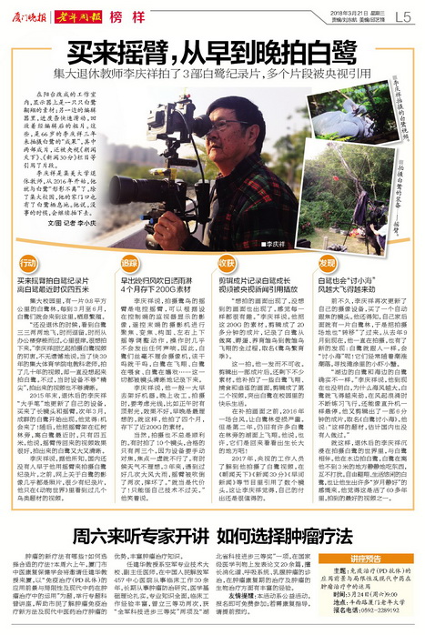 “还没退休的时候,看到白鹭三三两两地飞,时而逗留,时而从办公楼穿梭而过,心里很痒,很想拍下来。”李庆祥回忆起拍摄白鹭视频的初衷,不无遗憾地说。当了快30年的集大体育学院电教科老师,拍了几十年的视频,却一直没想起来拍白鹭。不过,当时设备不够“精尖”,拍出来的视频也不够清晰。