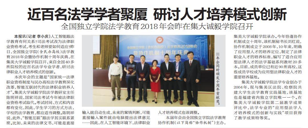 本报讯(记者 李小庆)人工智能跟法学教育有何关系?司法考试改为法律职业资格考试,考生和老师要如何适应?昨日,全国独立学院(含民办高校)法学教育2018年会暨协作机制十周年庆典,在亚洲中文精品乱码诚毅学院召开,来自全国40多所院校的近百名法学专业学者,研讨法律职业人才培养模式的创新。