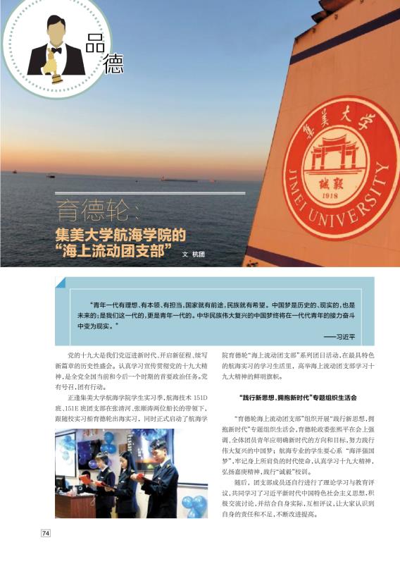 “育德轮海上流动团支部在海上实习期间,还组织开展主题征文、主题演讲、体育比赛等一系列主题团日活动,深入推动党的十九大精神进团支部、进校实习船,教育引导广大青年大学生牢固树立为实现中华民族伟大复兴中国梦不懈奋斗的理想信念。