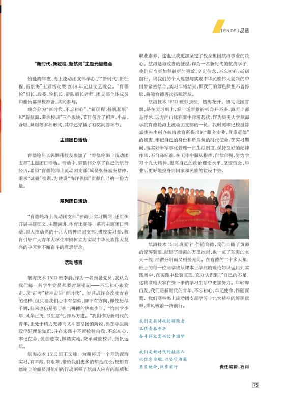 航海技术151E班夏宁:伴随育德,我们目睹了黄海的惊涛骇浪,经历了渤海的万里冰封,也一览东海的水天一线,泾渭分明而又相接无间。在育德的二十多天里,班上的每一位同学将从课本上学到的理论知识运用到实践当中,在实践中检验真理,充分认识到了自己的不足,这将激励大家在接下来的学习生活中更加努力。年轻即出发,我们是新时代的青年,不忘初心,牢记使命,伴随深蓝,我们高举海上流动团支部学习十九大精神的鲜明旗帜,乘风破浪一路前行。