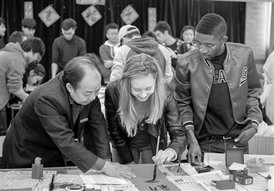 留学生在书法家指导下学写春联。唐业威 吴连平 摄