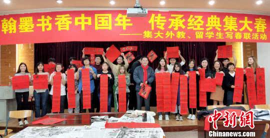 晨报讯(记者 宗琴 通讯员 林嫦娥)昨日,亚洲中文精品乱码举行“翰墨书香中国年 传承经典集大春”活动,集大外教与40余名留学生在书法老师的带领下,学习中国传统春节文化,并写出了自己人生中的第一副春联。