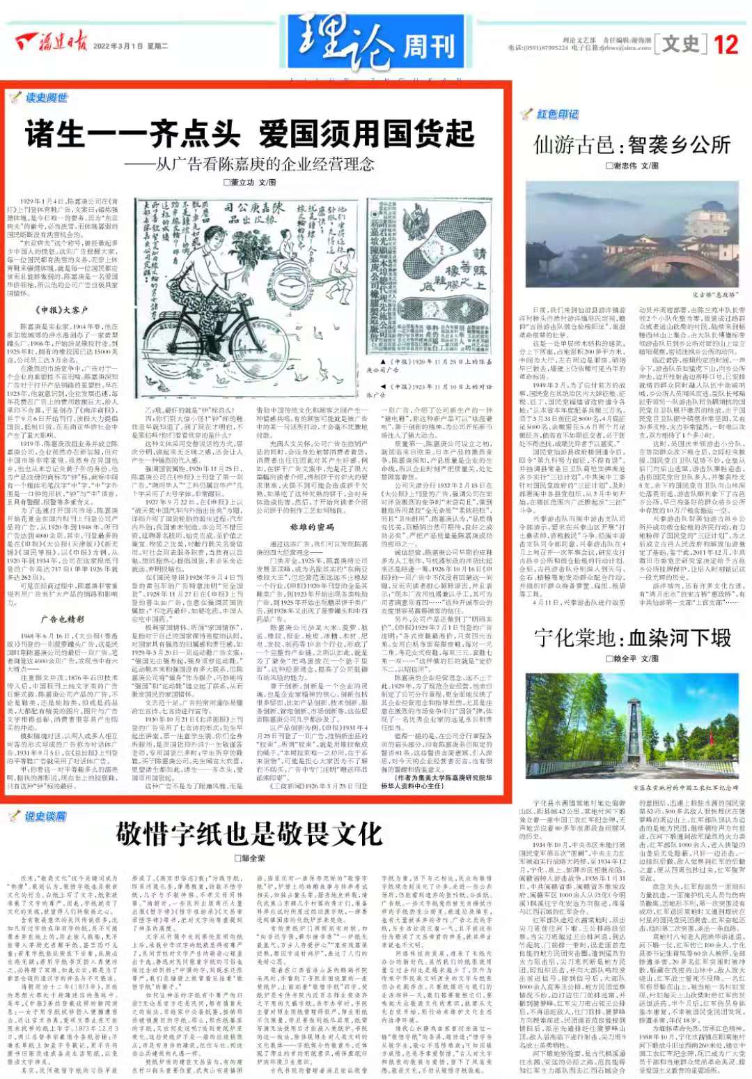 1930年10月21日《北洋画报》上刊登的广告采用了七言诗的形式:先生早起出讲堂,第一注意学生装。你们全身所服用,是否国货抑外洋?一生敬谨答老师,专用国货已多时;学生所穿的靴鞋,买于陈嘉庚公司。先生闻言大欢喜,更望诸生都如此。诸生一一齐点头,爱国须用国货起。