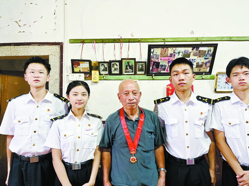 实践队队员与获“光荣在党50年”纪念章的老党员陈水河共同合影,留下珍贵的纪念照……