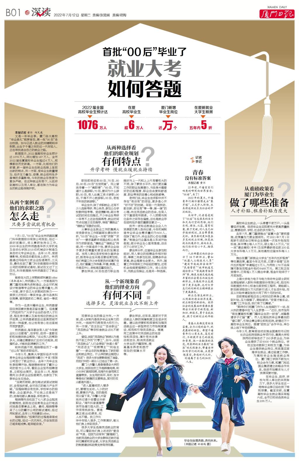 又是一年毕业季。厦门各大高校“毕业典礼”刷屏背后,第一批“00后”走出校园。如今已进入就业的关键期和冲刺期,出生于千禧之年的这一代年轻人,正在寻找适合自己的就业之路。