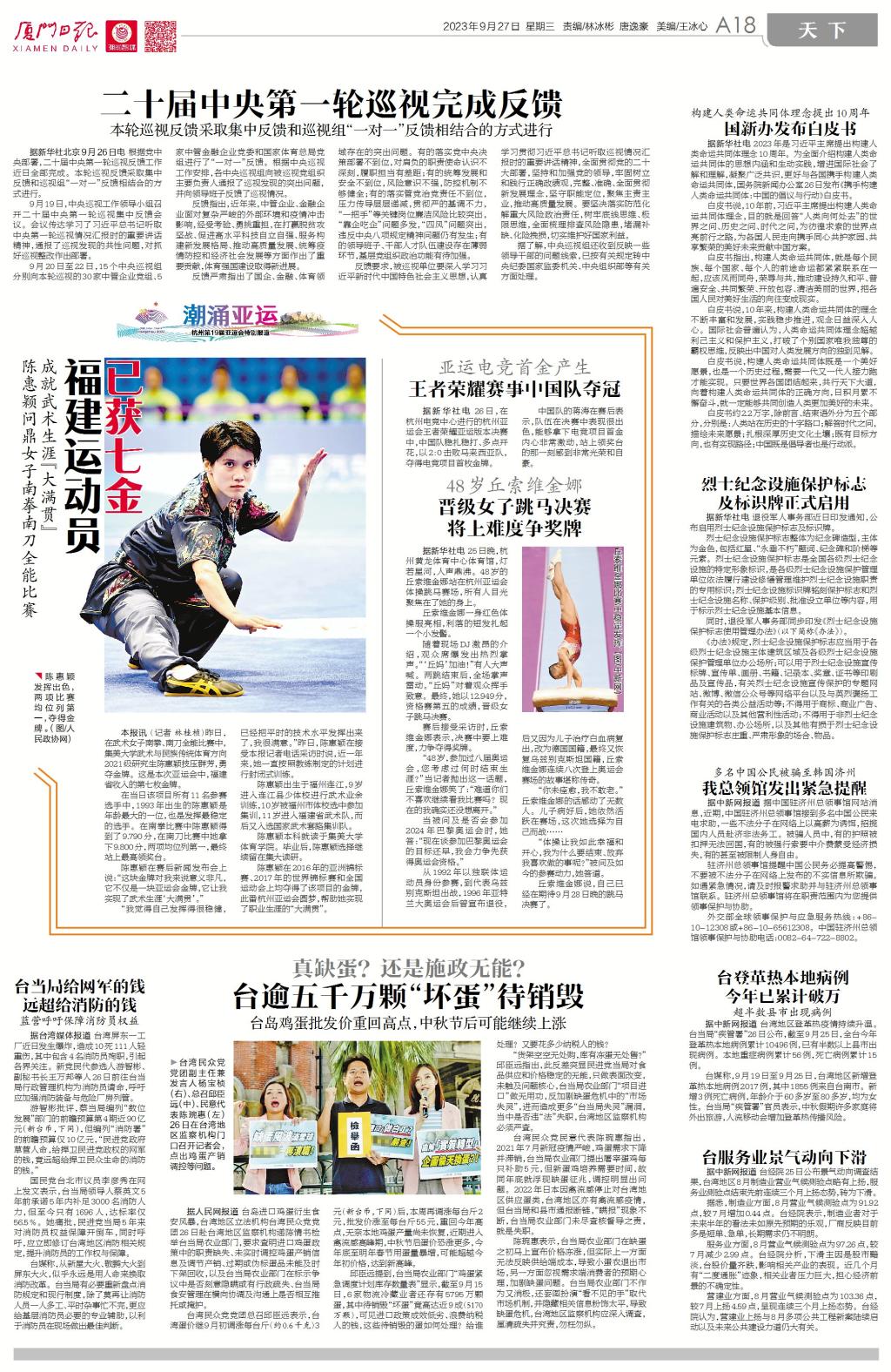 本报讯 (记者 林桂桢)昨日,在武术女子南拳、南刀全能比赛中,亚洲中文精品乱码武术与民族传统体育方向2021级研究生陈惠颖技压群芳,勇夺金牌。这是本次亚运会中,福建省收入的第七枚金牌。