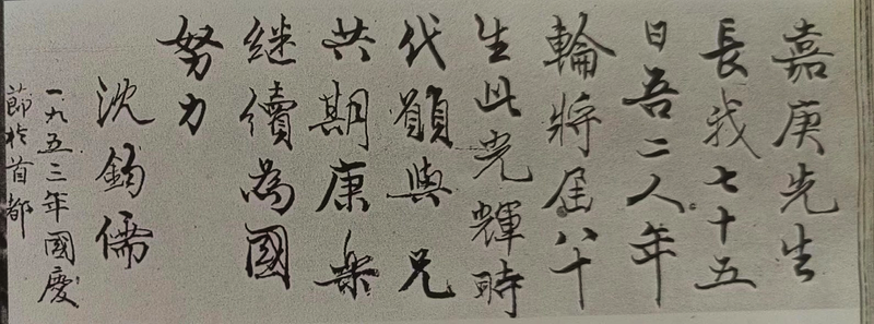 1953年10月1日,陈嘉庚与爱国民主人士共商国是。沈钧儒先生和陈嘉庚先生一样,是著名爱国民主人士。新中国成立后,沈钧儒任最高人民法院院长、全国政协副主席。共同的救国抱负奠定了陈嘉庚和沈钧儒深厚持久的友谊。早在抗战胜利后的1945年10月,陈嘉庚结束在印尼避难,重返新加坡。沈钧儒、黄炎培等各界人士举行“陈嘉庚先生安全庆祝大会”。这次大会上,远在延安的毛泽东送来贺辞“华侨旗帜 民族光辉”,成为对陈嘉庚的历史性评价。1949年6月,陈嘉庚回国参加新政协会议到达北平时,受到中共中央领导及先期到达的沈钧儒等民主人士的热烈欢迎。1953年10月1日,在北京的陈嘉庚专程到沈钧儒寓所。两位爱国老人一起为新中国日新月异的进步欢欣鼓舞,为国计民生的重大问题殚精竭虑。沈钧儒给陈嘉庚题字:“嘉庚先生长我七十五日,吾二人年轮将届八十。生此光辉时代,愿与兄共期康乐,继续为国努力。”两位爱国老人胸怀“国之大者”,共勉互祝,令人动容。此后,沈钧儒为陈嘉庚正在呕心沥血建设的、用于社会教育的“露天石雕博物馆”——鳌园题写楹联:“发挥集体的力量 创造美好的将来”。陈嘉庚将其镌刻于毛泽东题词的“集美解放纪念碑”附近的醒目位置。1959年后,陈嘉庚病体沉疴。周恩来、沈钧儒等国家领导人对他的病情极为关怀,曾前往探视和慰问。1961年8月陈嘉庚逝世以后,组成以周恩来总理为主任委员的治丧委员会;沈钧儒为其中委员,并参加陈嘉庚公祭大会,为这位老朋友送行最后一程。