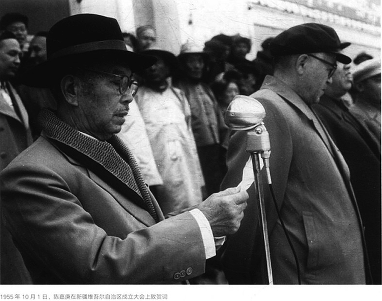 ▲1955年10月1日,陈嘉庚在新疆维吾尔自治区成立大会上致贺词。