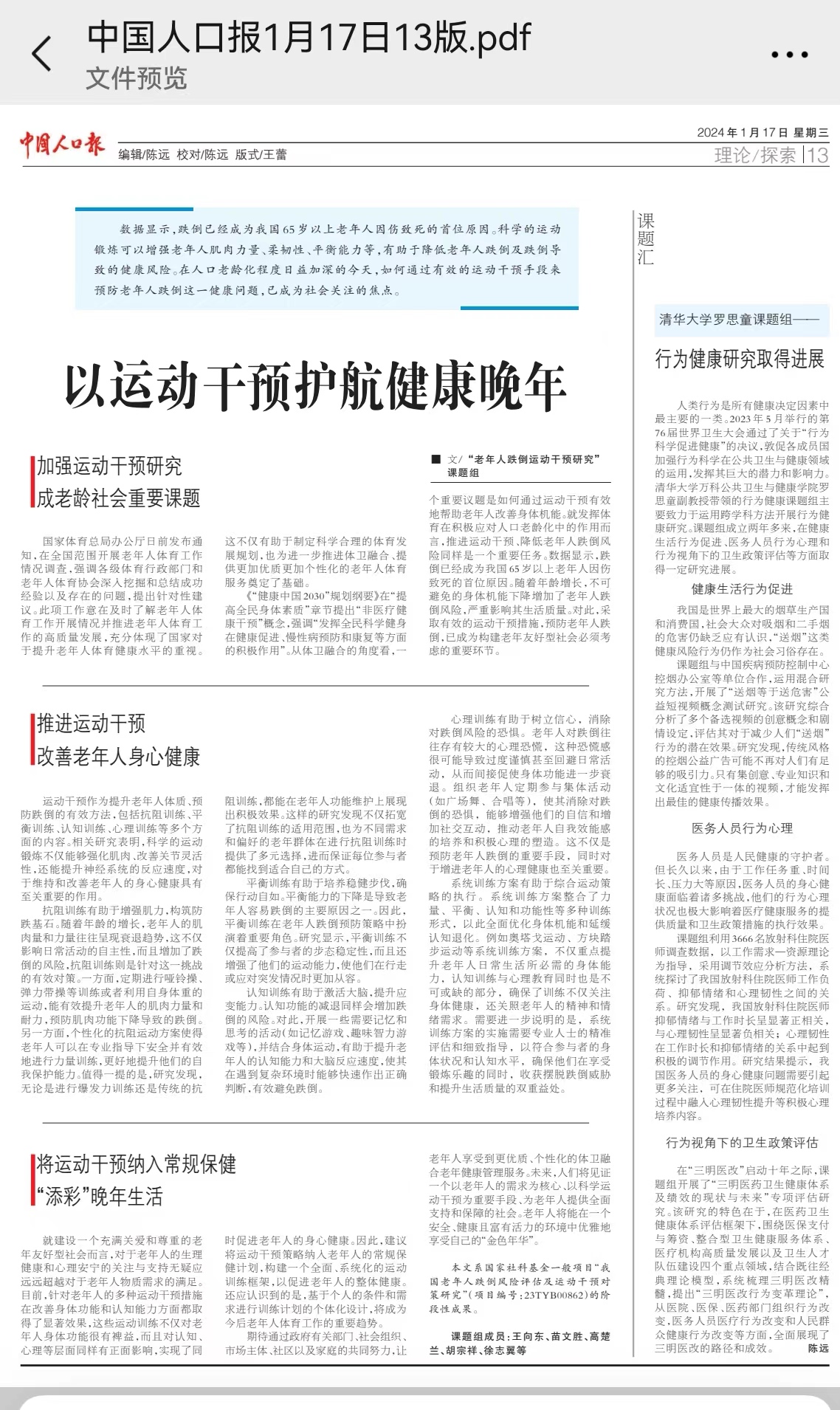推进运动干预改善老年人身心健康
