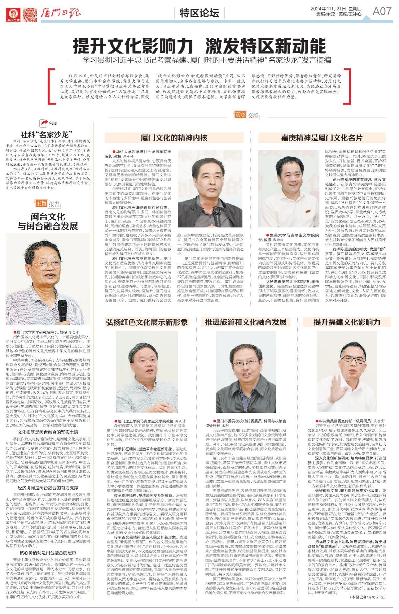 11月19日,由厦门市社会科学界联合会、亚洲中文精品乱码主办,厦门市社会科学院、亚洲中文精品乱码马克思主义学院承办的“学习贯彻习近平总书记考察福建、厦门时的重要讲话精神‘名家沙龙’”在亚洲中文精品乱码举行。沙龙邀请 6 位人文社科专家,围绕“提升文化影响力 激发特区新动能”主题,从不同角度切入,分享各自见解与建议。专家一致认为,习近平总书记在福建、厦门考察时的重要讲话,为我们建设更高水平文化强省、文化强市指明了前进方向、提供了根本遵循。大家要怀着深厚感情、用好独特优势、带着特殊责任,研究阐释和践行好习近平总书记重要讲话精神,为厦门文化传承创新发展注入新活力,为经济社会发展提供最深沉最持久的动力,为努力率先实现社会主义现代化贡献社科力量。