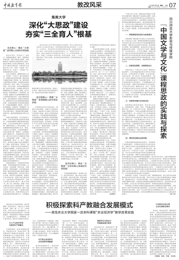 夯实主体联动,凝聚协同育人合力。学校将“三全育人”融入发展各环节,巩固综合试点改革成效,制定实施方案提升思政工作质量。校、院领导深入落实联系学生制度,校党委书记和校长带头参与“同心·同行”学生面对面活动,与学生交流,为学校决策提供依据,助力学生成长。全面推行本科生导师制和班主任工作制度。例如,水产学院打造“校内外联动、产学研协同”班主任制,邀请水产企业和科研院所专业人员担任校外班主任,为学生提供实践指导、组织实践活动、推荐实习就业岗位,鼓励所有学生参与科研训练或科创竞赛。注重加强教育主体间的沟通协作,完善思政课教师、辅导员、班主任的交流机制,定期举办“思政联谈”活动,围绕课程教学内容和思政教育内容及方式展开探讨,促进教育理念碰撞、经验共享,提升思政教育的针对性与实效性。